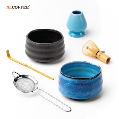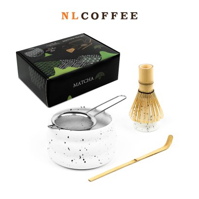 ครบชุด (5) ถ้วยชงชามัทฉะสีขาว, แท่นวางแปรงมัทฉะ , ไม้ไผ่คนส่วนผสม , ไม้ตักผงมัทฉะ , ตะกร้อกรองผงมัทฉะ