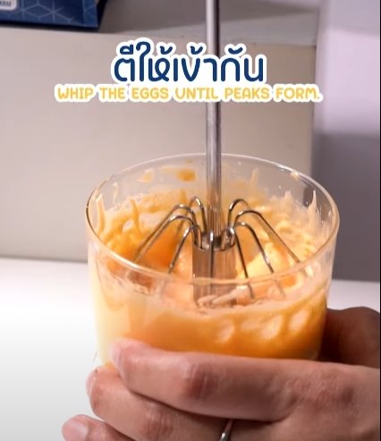 3.ใช้ตะกร้อตีไข่และน้ำตาลให้เข้ากันจนฟู