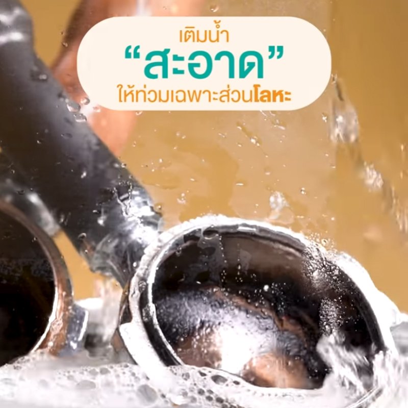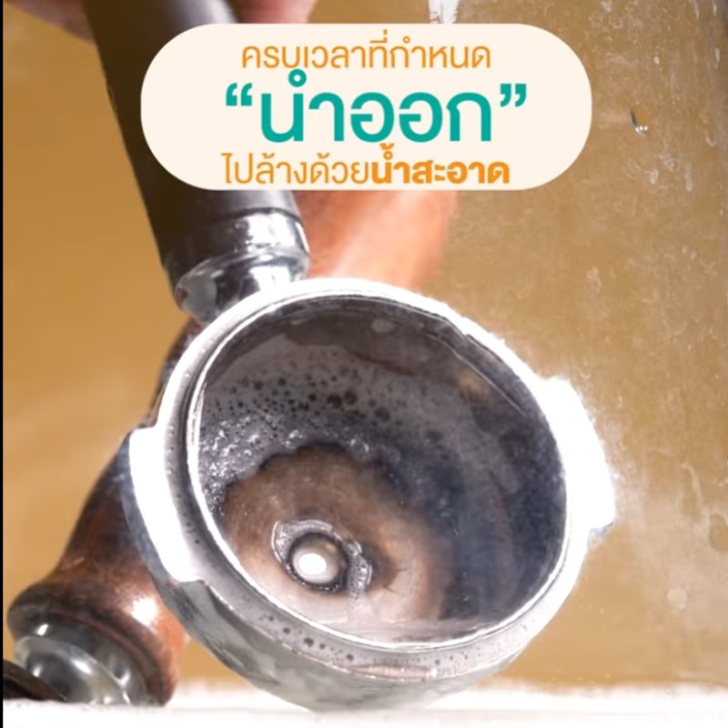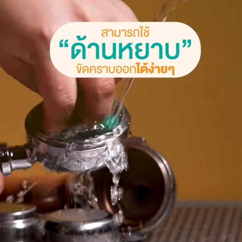 4.เมื่อครบเวลา นำด้ามชงและตะแกรงออกมาล้างน้ำสะอาด และใช้ สก็อตไบร์ท ขัดให้สะอาด
