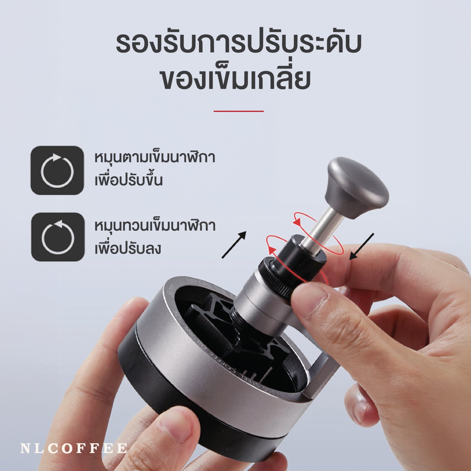 หมุนตามเข็มนาฬิกาเพื่อเพิ่มความลึกของการกระจาย หรือหมุนทวนเข็มนาฬิกาเพื่อลดความลึก ทำให้สามารถควบคุมความลึกของผงกาแฟได้อย่างแม่นยำ