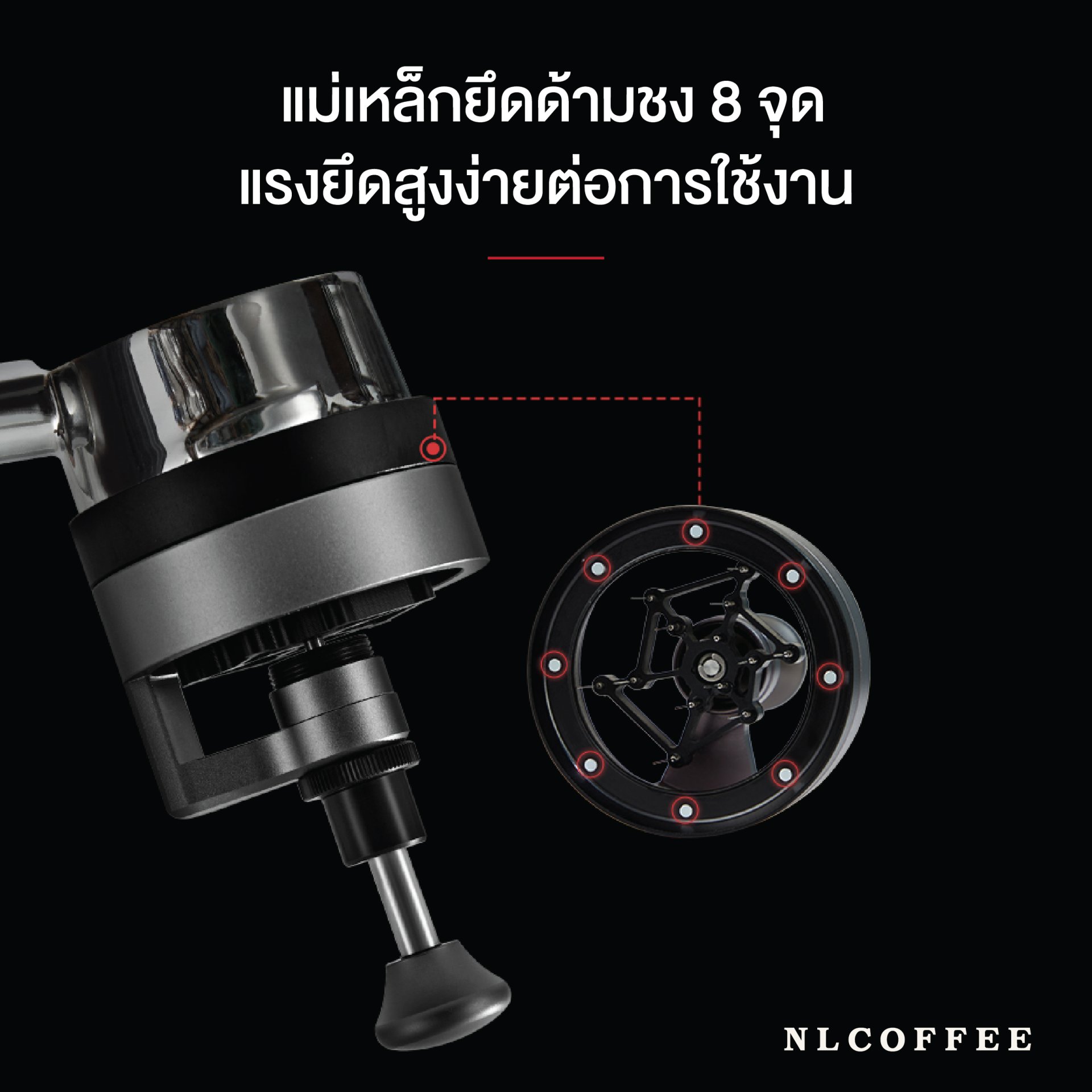 ฐานแม่เหล็กยึดเครื่องมืออย่างแน่นหนา ช่วยให้กระจายผงกาแฟได้อย่างรวดเร็วและสม่ำเสมอด้วยการเคาะเพียงสองครั้ง สลายก้อนกาแฟได้อย่างง่ายดาย และเพิ่มกลิ่นหอมและรสชาติที่เข้มข้นของเอสเพรสโซ่
