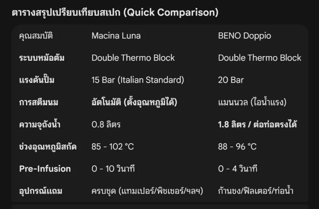 ตารางสรุปเปรียบเทียบสเปกคุณสมบัติ Macina Luna VS BENO Doppio