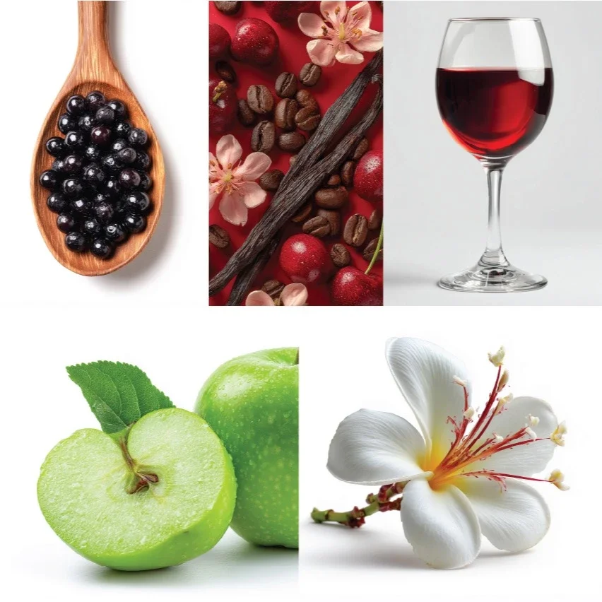แอปเปิ้ล ,ดอกไม้ , ไวน์ , ดาร์คเบอร์รี่ ,ชาดำ