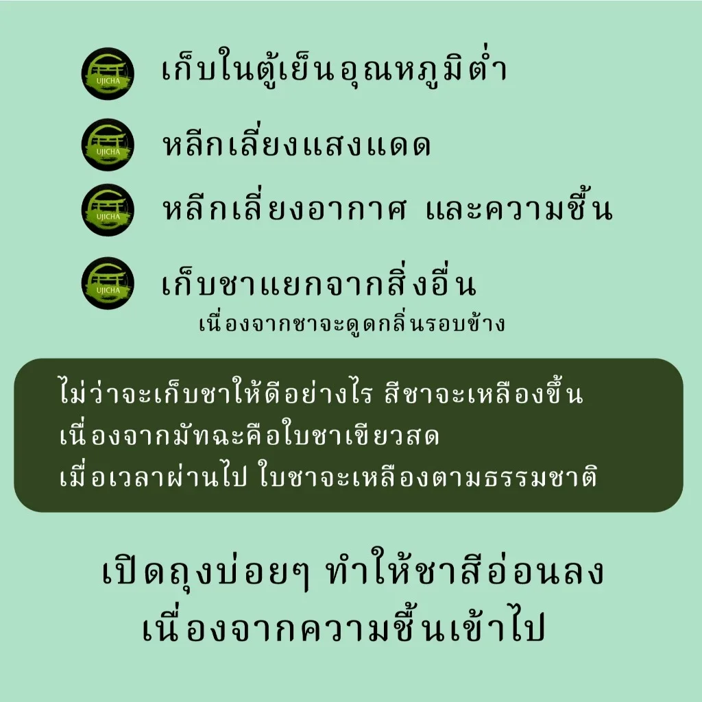 สีเขียวเข้ม (Extra Green): มีสีเขียวมรกตที่สดใสและเข้มกว่ามัทฉะจากแหล่งอื่นมาก ซึ่งบ่งบอกถึงคุณภาพและการผลิตที่พิถีพิถัน (เช่น การบดด้วยโม่หิน)